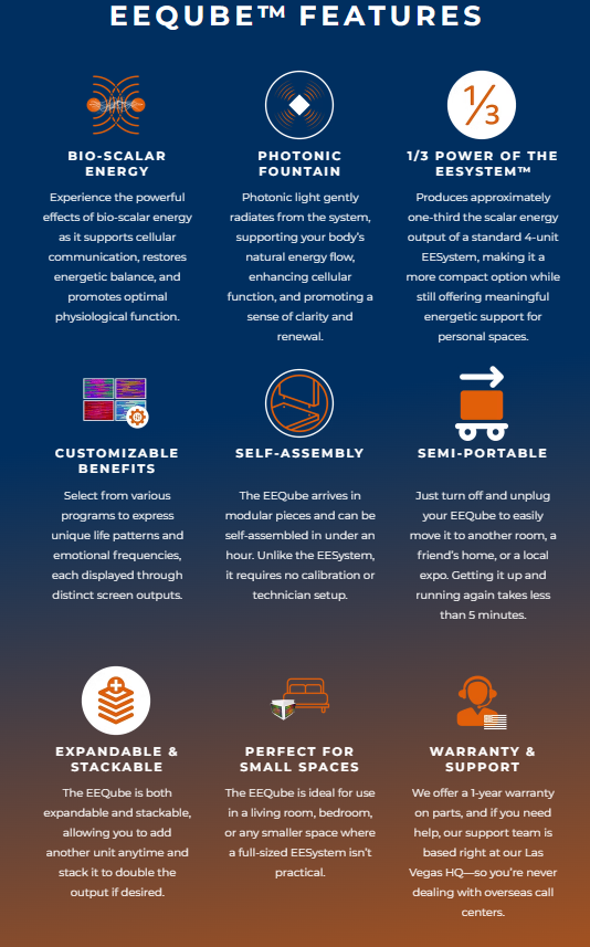 The EEQube™ is a miniaturized 4-unit system aligned for precise phase conjugation inside the cube creating coherence and nullification of detrimental field effects with out-facing monitors quantum photonic fields generation.